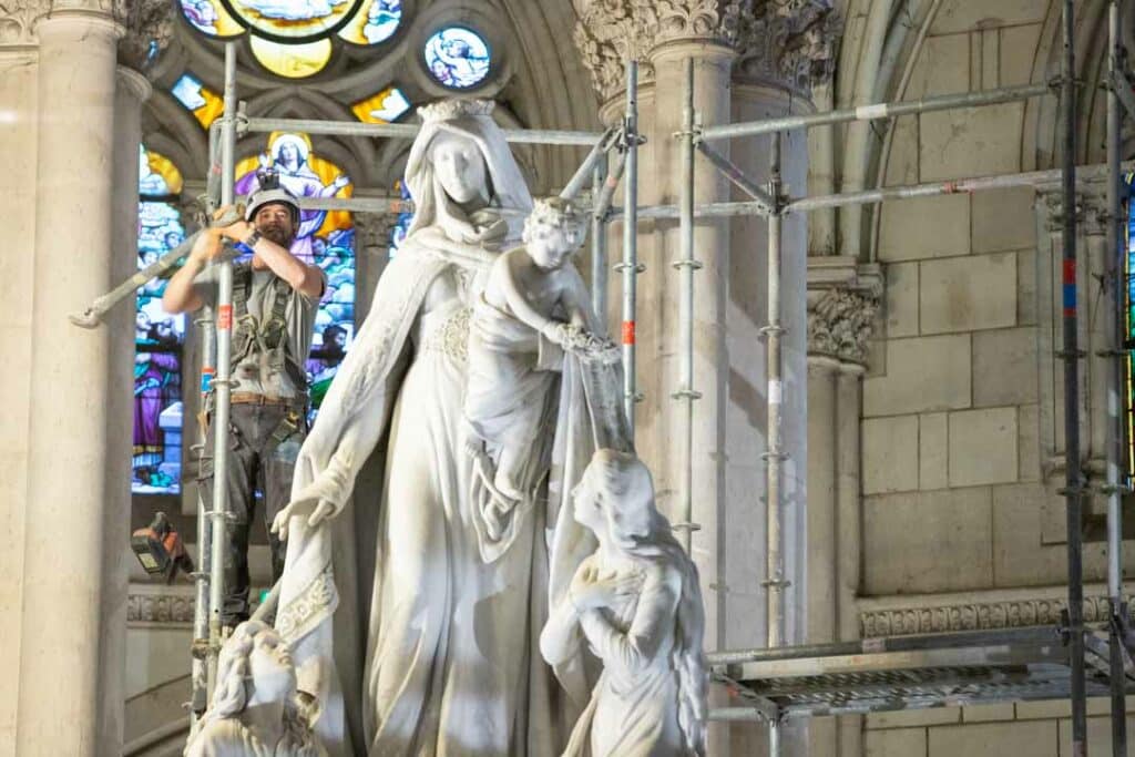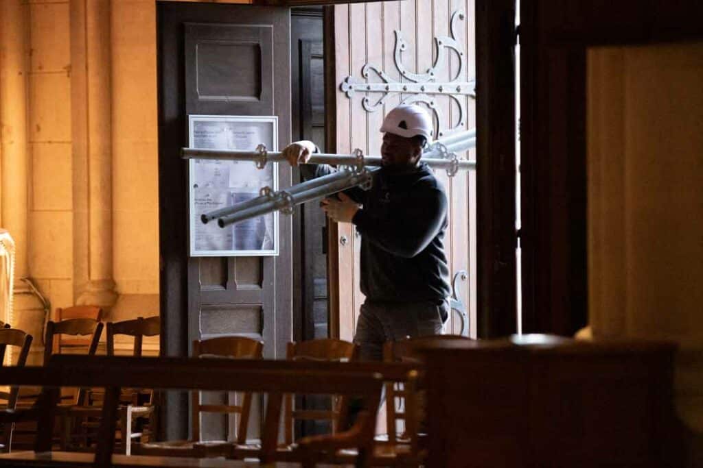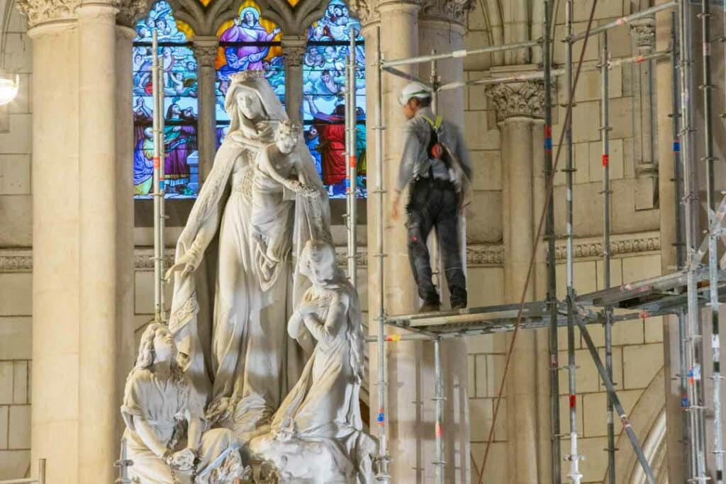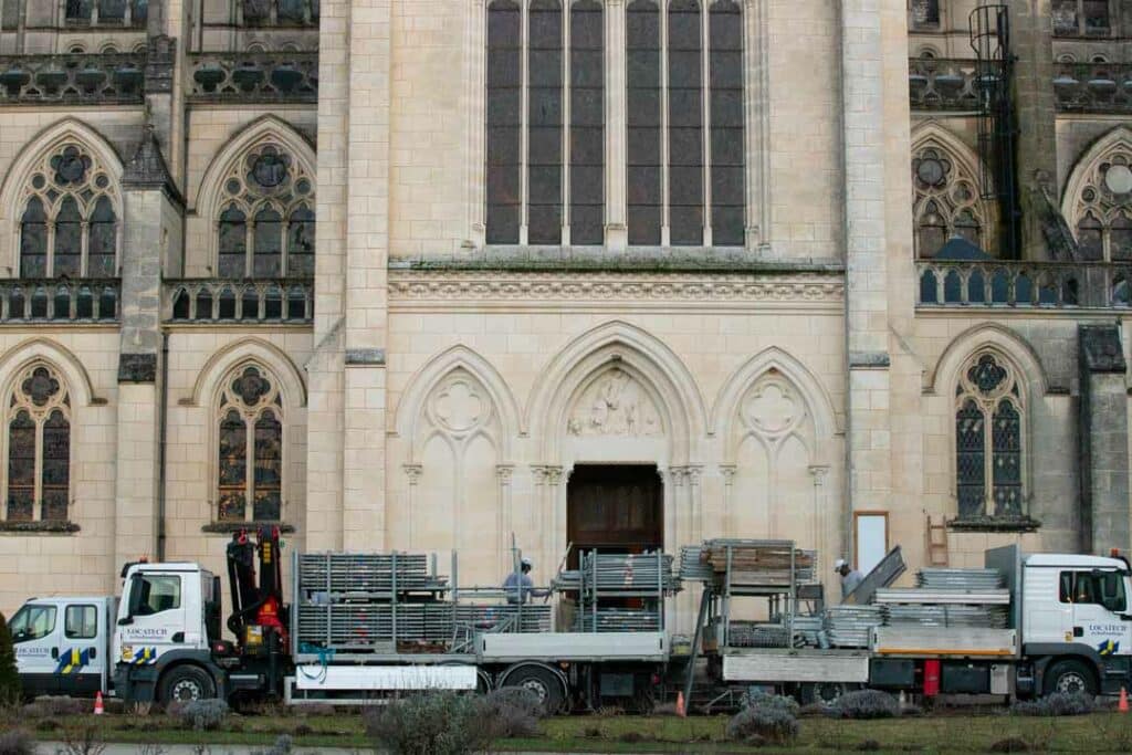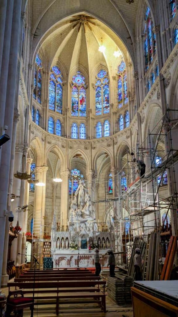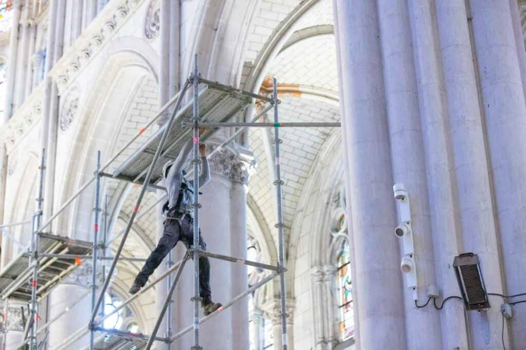 La première tranche des travaux du chœur de la basilique a commencé le mardi 13 janvier avec la pose des échafaudages intérieurs pour le démontage des vitraux afin de permettre leur restauration.