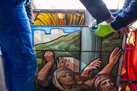 Nel laboratorio, il lavoro di restauro consiste principalmente nel riparare la struttura, che non è più in grado di tenere in posizione le vetrate: i vecchi piombi, che si sono ossidati, si sono deformati e non sono più in grado di tenere insieme i pannelli. Devono essere rimossi e sostituiti uno per uno. Una volta smontati, i pezzi di vetro vengono puliti, le rotture vengono incollate e il tutto viene rimesso a piombo prima di essere risaldato. Gli artigiani sigillano poi le giunzioni con stucco e vernice.